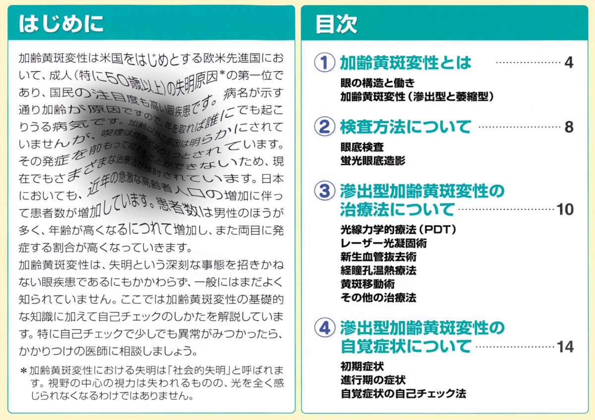 加齢黄斑変性症の症状を老化現象と考えてしまう人が多い。両眼とも発症する割合が高い。現在行われている治療は、継続的な治療が必要である。